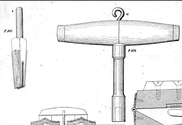 Figure 272 French upright piano sticker action; Fig. 274 upright piano action with keystick; Fig 275 upright overdamper action by Brinsmead, London; Fig. 276 upright overdamper action by Alison & Son of London; Fig. 306 Tuning hammer, lever type.