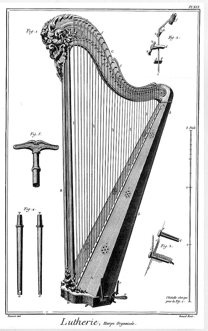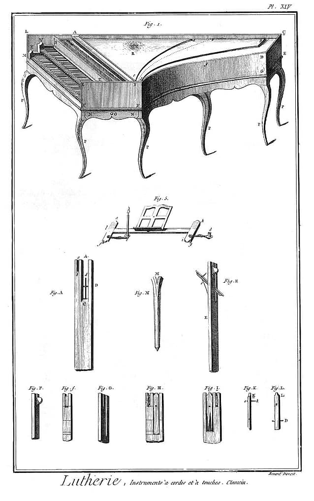 Diderot Lutherie plate16 with keyboard/keyframe, Psaltery (string instrument with stick), and spinet harpsichord.