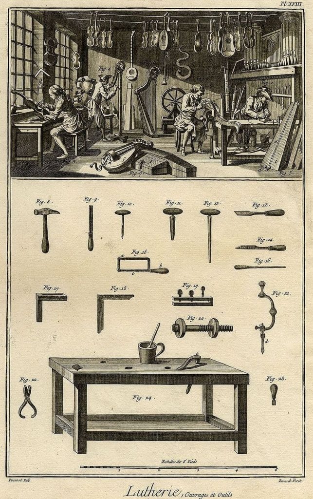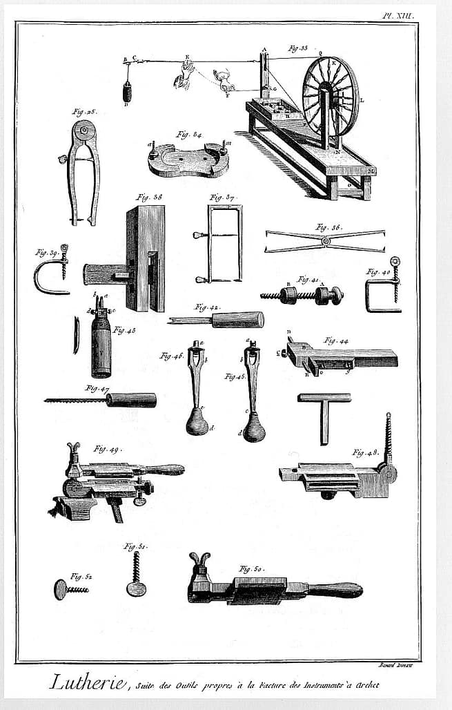 Diderot, volume 5, plate showing stringed instrument components and three ovoid shaped violin planes. By the 1760s, luthier planes had developed into the basic design that is still used today.Diderot:
