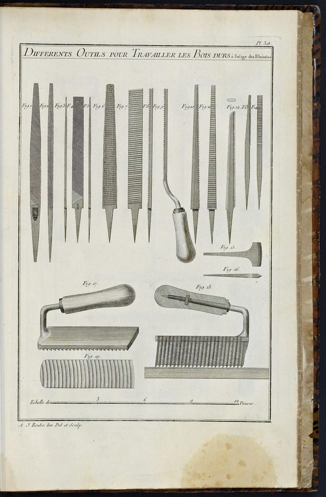 This page contains plates or diagrams of early tools, some used for pianos, some for musical instruments, and others for more general applications. These basic cabinet makers tools are included as well, because many were used in the piano industry.