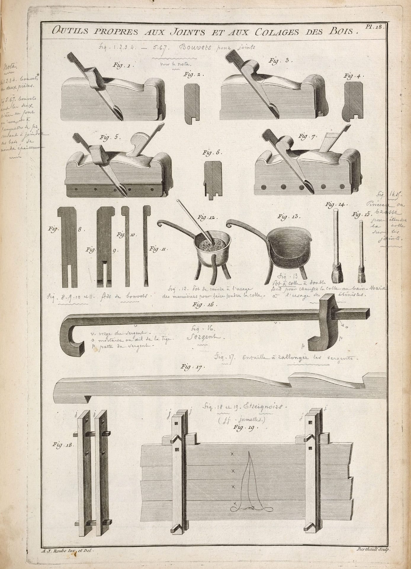 Roubo: L’Art du Menuisier. André Jacob Roubo (1739–1791) an accomplished cabinet maker, wrote this book between 1769 and 1774. The following are selected plates from that book. L’Art du Menuisier vol.3 can be seen here.