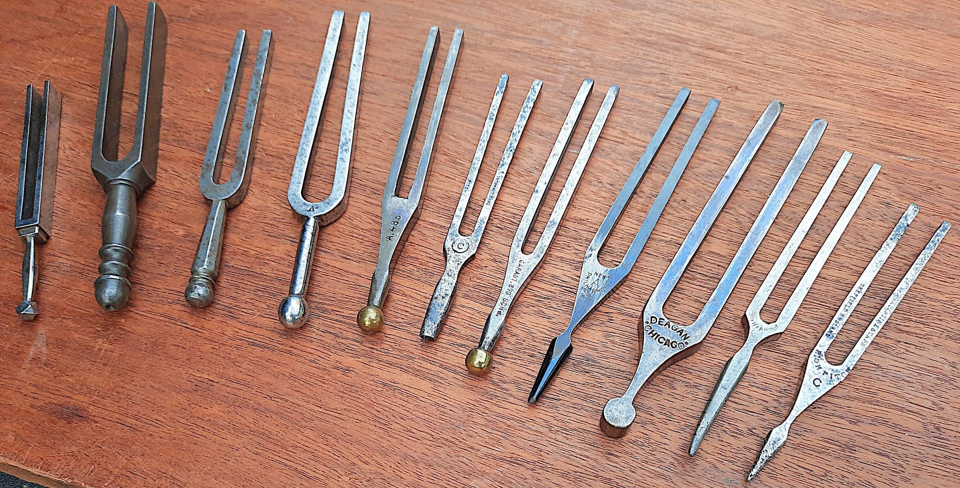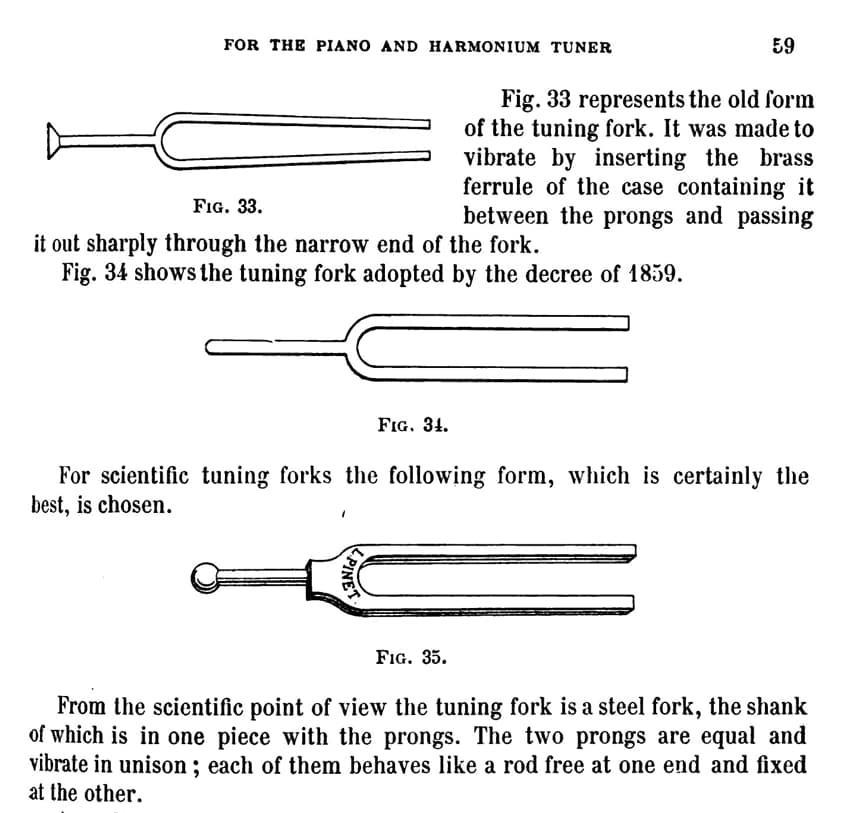 Antique tuning fork, French Pattern Tuning Fork circa 1859, an “Scientific” modern tuning fork. From Practical Manual for Piano and Harmonium Tuner, by Nugues, Pouget, and Martin; published by L. Pinet 1913.