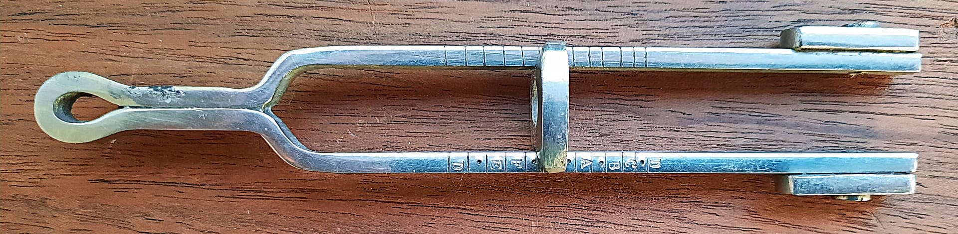 Another adjustable tuning fork, early 20th century. The higher the bridge (away from the crotch of the fork), the lower the pitch, and the lower the bridge, the higher the pitch. The example below has individual adjustable weights, which, when moved to their seven adjustment points, approximate seven (c to f#) semi-tones of the equally tempered scale.