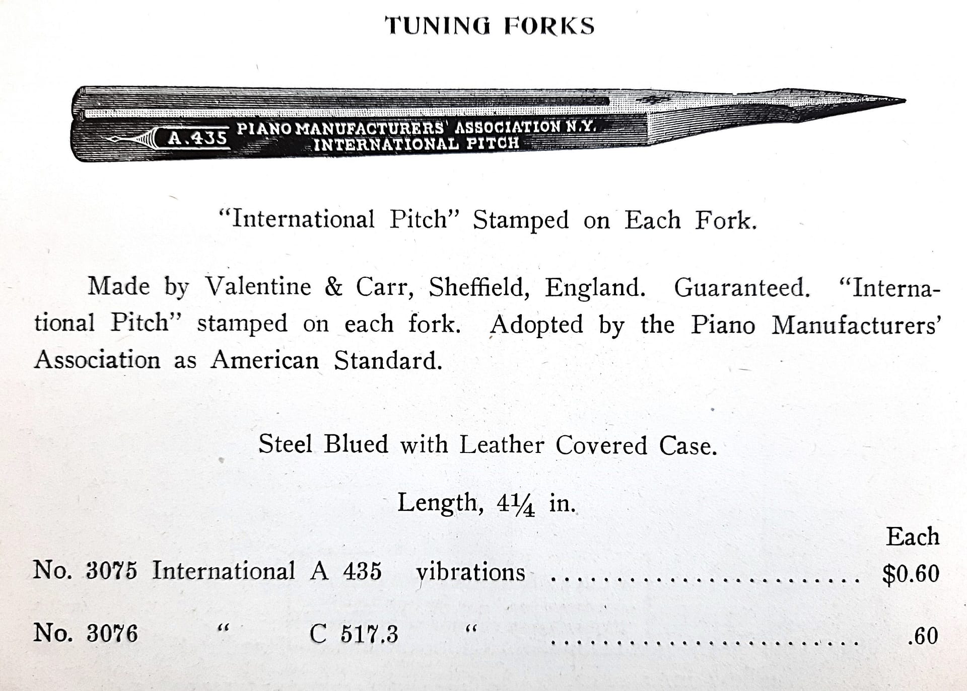 The comprehensive 357-page American Felt Company catalog for 1911 has a number of forks available both in traditional polished steel as well as the new “blued” forks (to prevent rust) between a low pitch of A435 and a high pitch of A454. It was common to tune very high A between the 1860s until the turn of the twentieth century, in the U.S. as well as much of Europe. Here are two pages from that catalog: