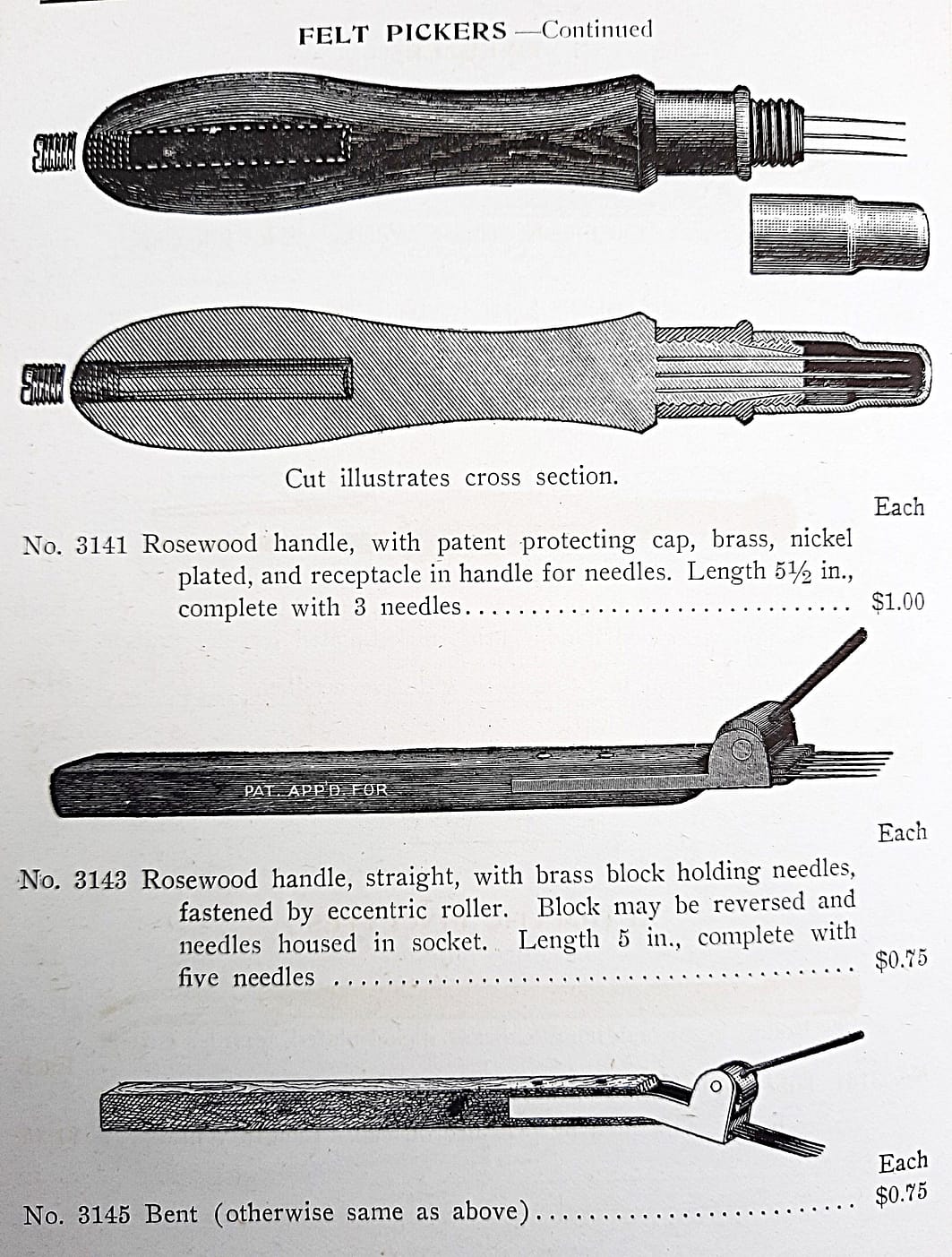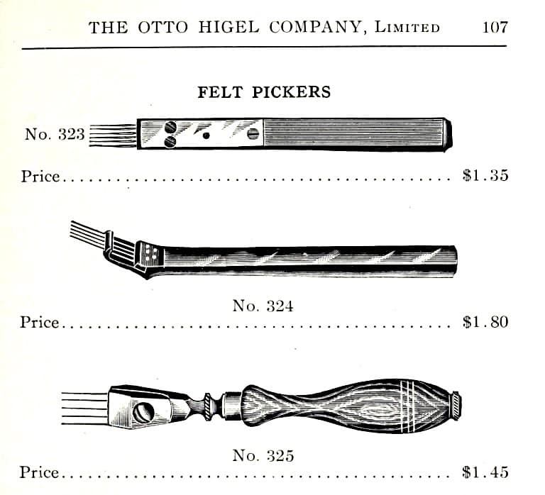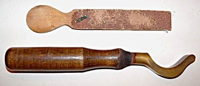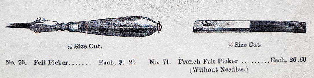 The tool shown on the left was made by the American Felt Co.,which succeeded the supply house of Alfred Dolge and Son around 1900. Other two tools were sold by Hammacher Schlemmer and Co, and have a cutout design unique to this supplier.
