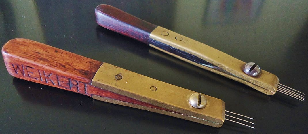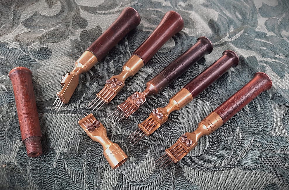 Three English voicing tools, all with six needles. In England, these tools were called toning needles. George Buck at 242 Tottenham Court Road in London sold the one in the foreground. Other two are unmarked. On the left is a beech-handled voicer shaped like a Shaker peg.