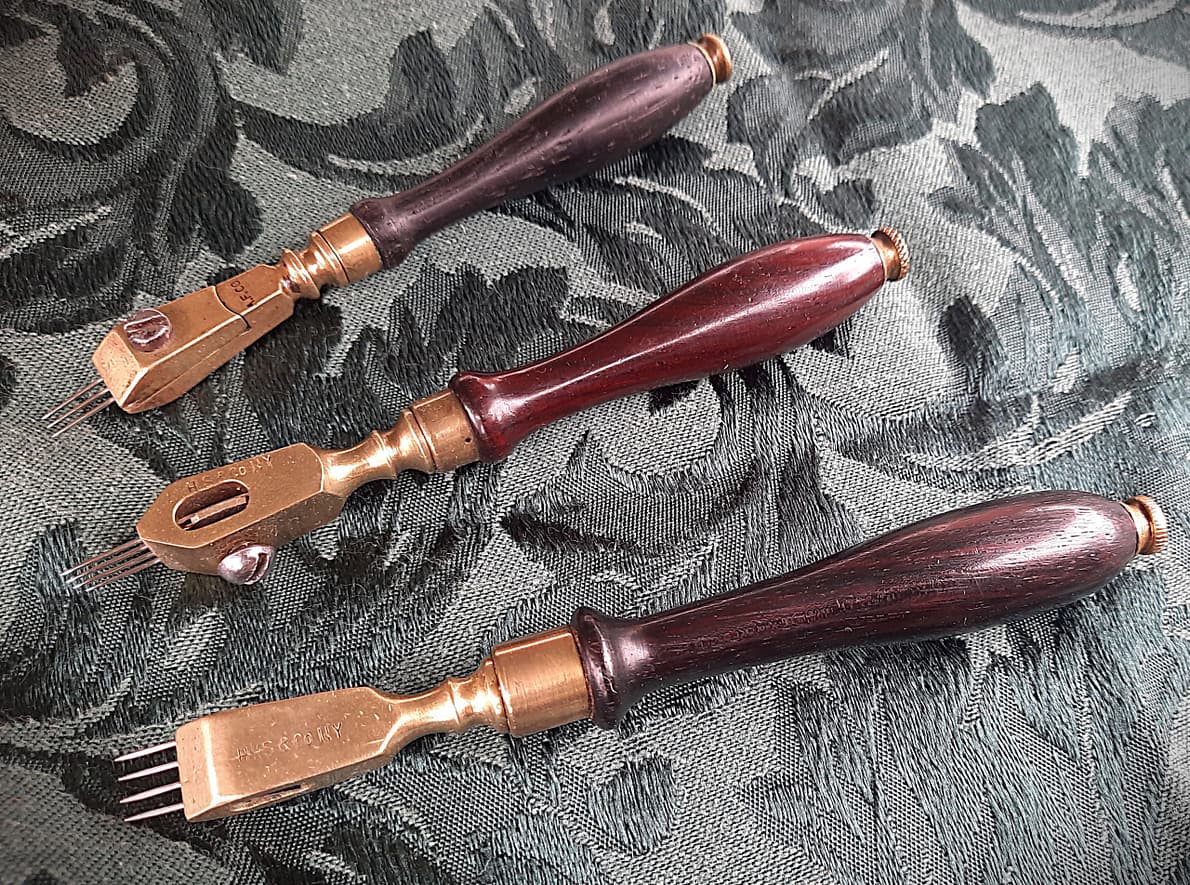 Three 19th century voicing tools of a particular style. These voicing tools resemble the design of the the tool on the left side of the catalog excerpt at the top of this page. All of these tools have a convenient storage space for extra needles in the back of the handle, under the thumbscrew.