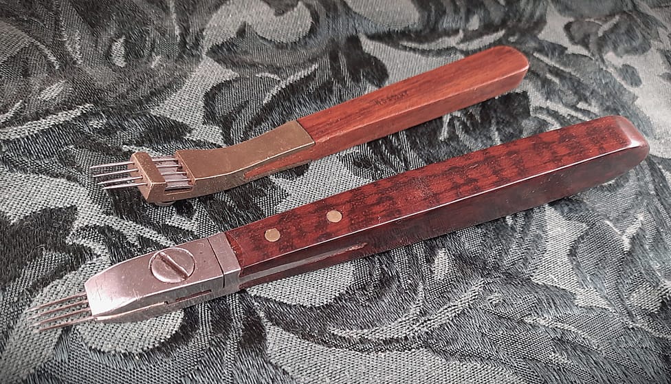 Three rare and unusual 19th century voicing tools. Three unusual voicing tools. The voicing tool at the top is curved, and has a shape much like the adjustable models which came later. This tool has ebony infill surrounded by bronze. The “French style” voicer, middle, is made from pretty laminations of ivory and ebony. The bronze and rosewood McIntosh felt picker has 10 needles, tools with multiple needles like this (but not as many) have sometimes been called “sugar coaters” for very shallow needling in the crown area of the hammer. This particular tool is wide enough to treat two hammers at once.