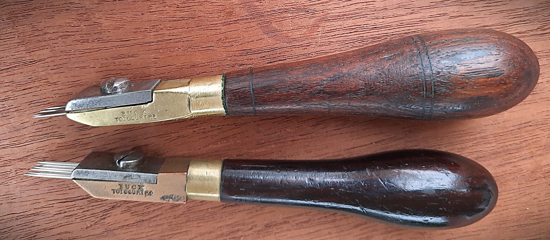 Two Buck Toning Needles, both made by Richard Reynolds. The one with a bronze head originally was marked for Reynolds, but that was filed off and restamped “G. BUCK TOT. COURT RD.”