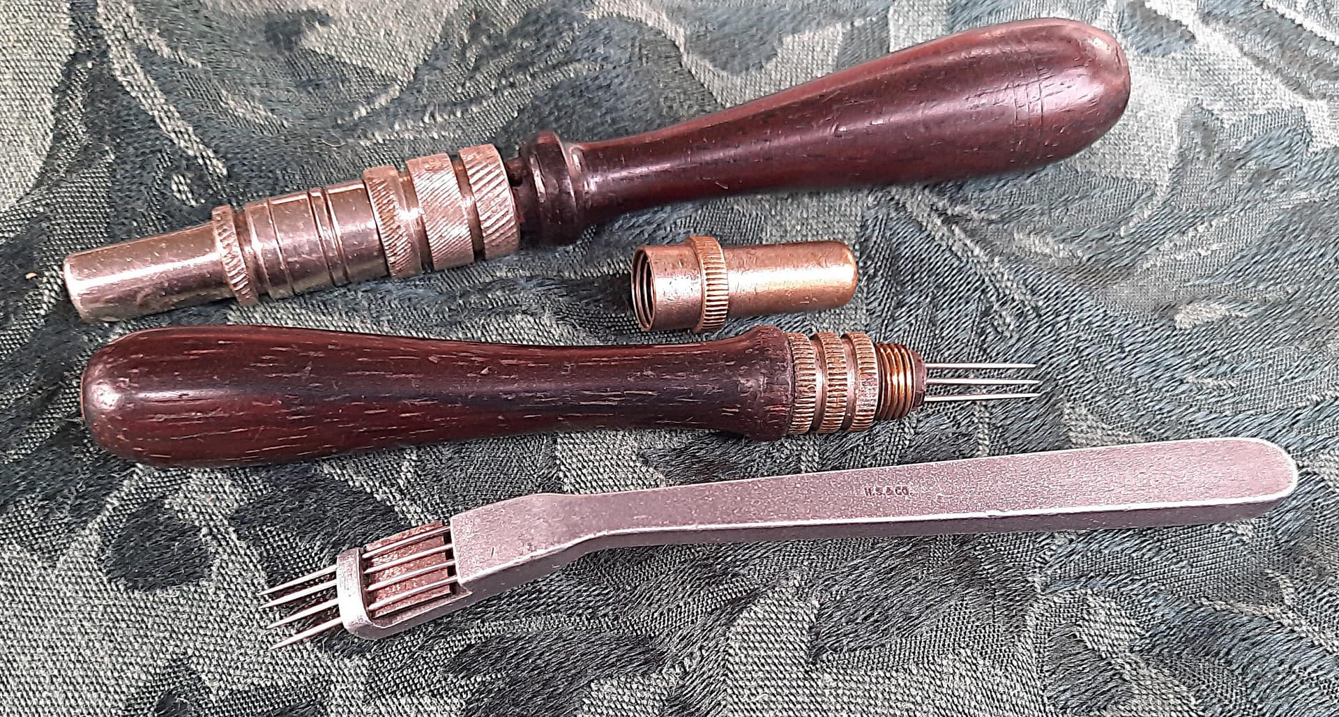 The tool shown on the left was made by the American Felt Co.,which succeeded the supply house of Alfred Dolge and Son around 1900. Other two tools were sold by Hammacher Schlemmer and Co, and have a cutout design unique to this supplier.