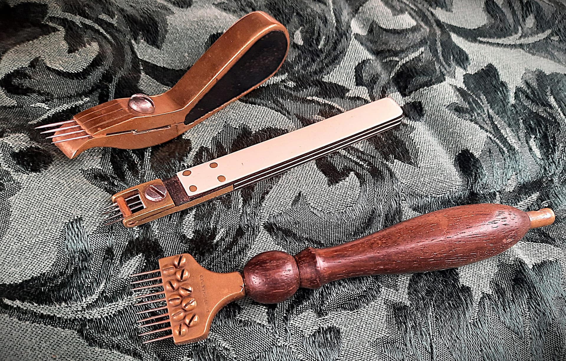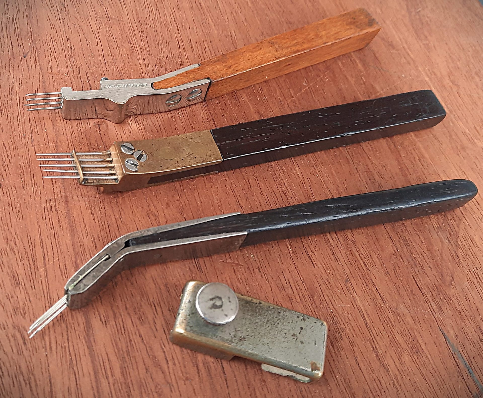 Three rare and unusual 19th century voicing tools. Three unusual voicing tools. The voicing tool at the top is curved, and has a shape much like the adjustable models which came later. This tool has ebony infill surrounded by bronze. The “French style” voicer, middle, is made from pretty laminations of ivory and ebony. The bronze and rosewood McIntosh felt picker has 10 needles, tools with multiple needles like this (but not as many) have sometimes been called “sugar coaters” for very shallow needling in the crown area of the hammer. This particular tool is wide enough to treat two hammers at once.