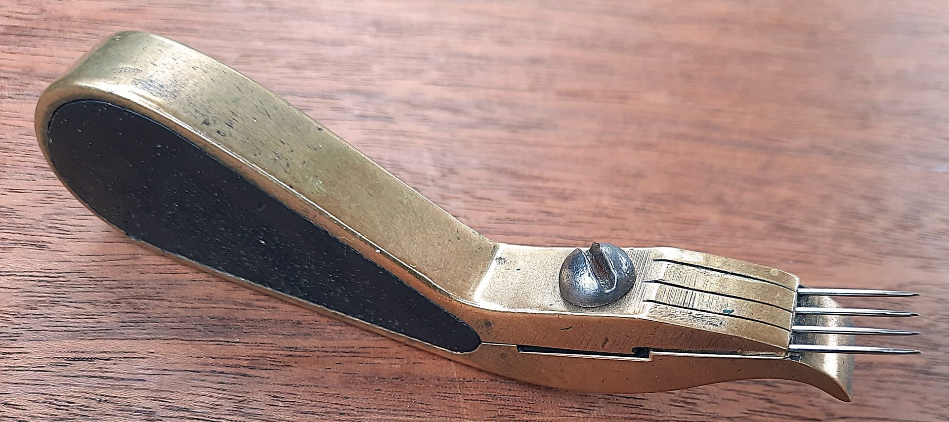 Three voicing tools made in the ‘French’ style. Three tools made in this ‘French’ style. These examples all have a downward curve on the business end, to give more ready access to the hammer head, The one on the top is a German-made tool, a Renner type, from the mid-20th century, and is one of the least old tools in this presentation. The rosewood, bronze, and brass voicer in the middle, c. 1900, has five needles, but only three set screws. The dark rosewood, steel, and brass tool in the foreground is worn so smooth that I think it probably has been used in a production environment. This felt picker came with a protective shield so that it could be carried in a pocket without injury.
