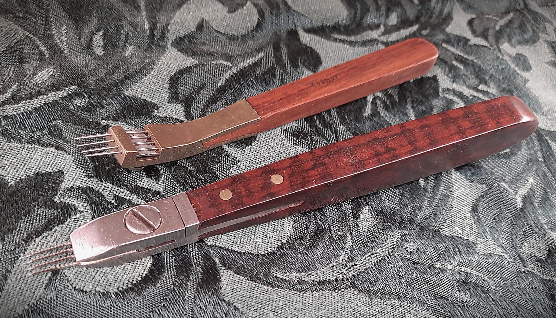 Two 19th century rosewood voicing tools, with cover for needles, and storage in handles. All metal French type, marked H.S. & Co. N.Y.