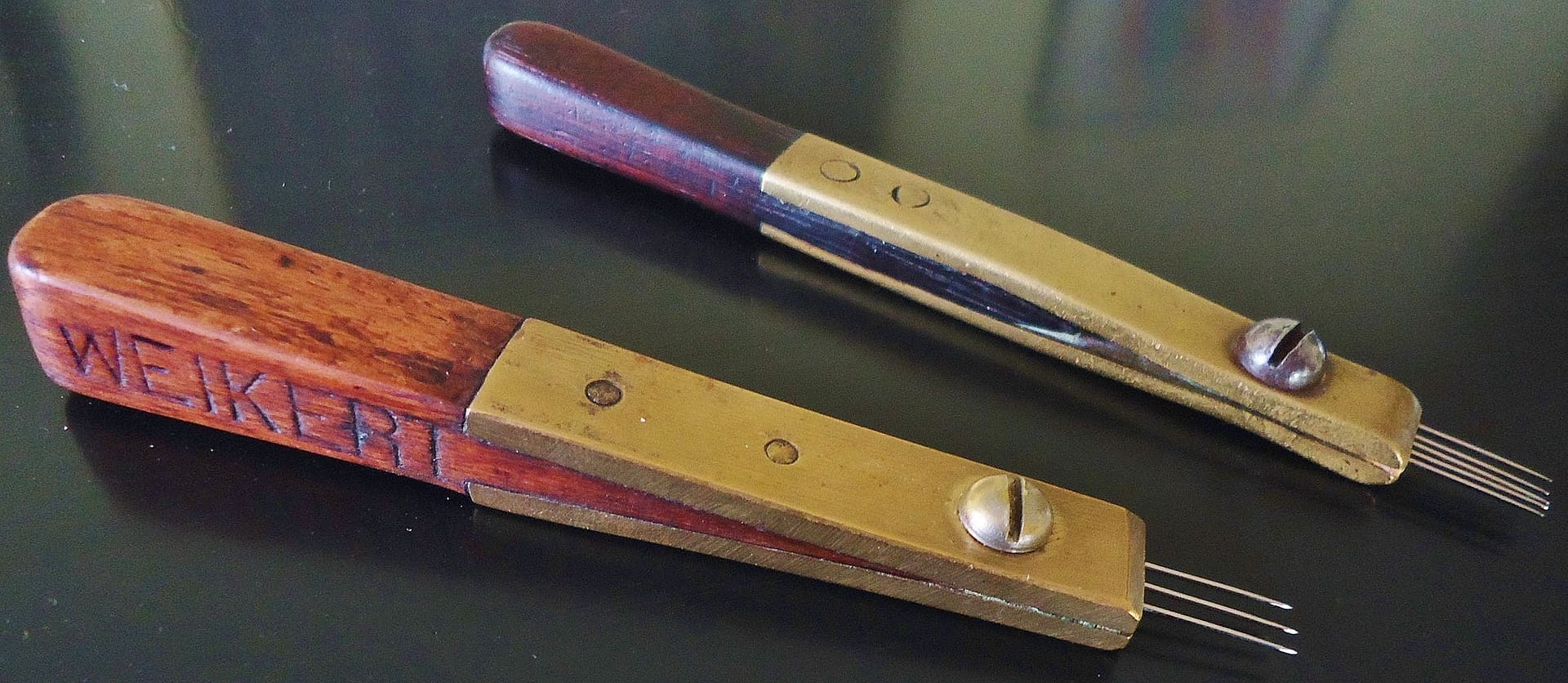 Three 19th century voicing tools of a particular style. These voicing tools resemble the design of the the tool on the left side of the catalog excerpt at the top of this page. All of these tools have a convenient storage space for extra needles in the back of the handle, under the thumbscrew.