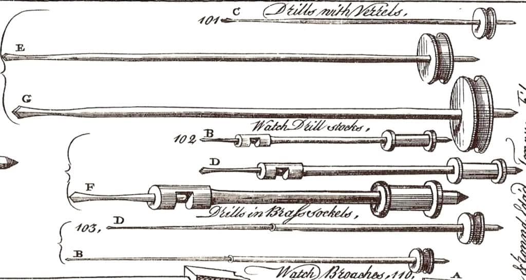 Three bow drills (r.), offered by Alfred Dolge in his 1892 catalogue. Erlandsen’s, shown on top, was sold as the choice with #1 quality; the others were less expensive.