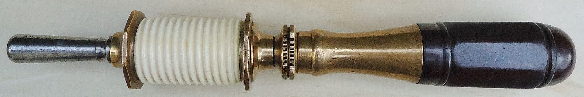 Rear view of the ebony handled drillstock (l.). Even the more basic piano drills show precision and elegance. Here is the rear view of the ebony handled drillstock, showing a steel friction adjustment screw bushed in brass. Mirrored from the brass spool with triple step, the handle ferrule shows the same detailing.