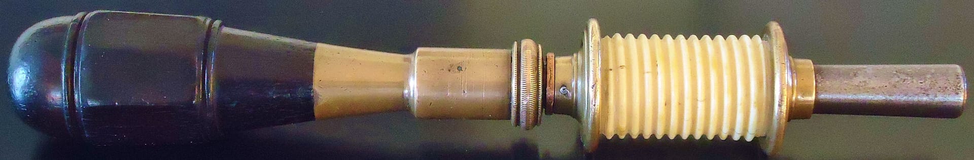 N. Erlandsen bow drill partially disassembled. An adjustment screw at the back of the ferrule adjusts the amount of play/friction for the rotation of the spindle. Ivory spindles would tend to crack under the stress of constantly reversing direction while driven by the bowstring.