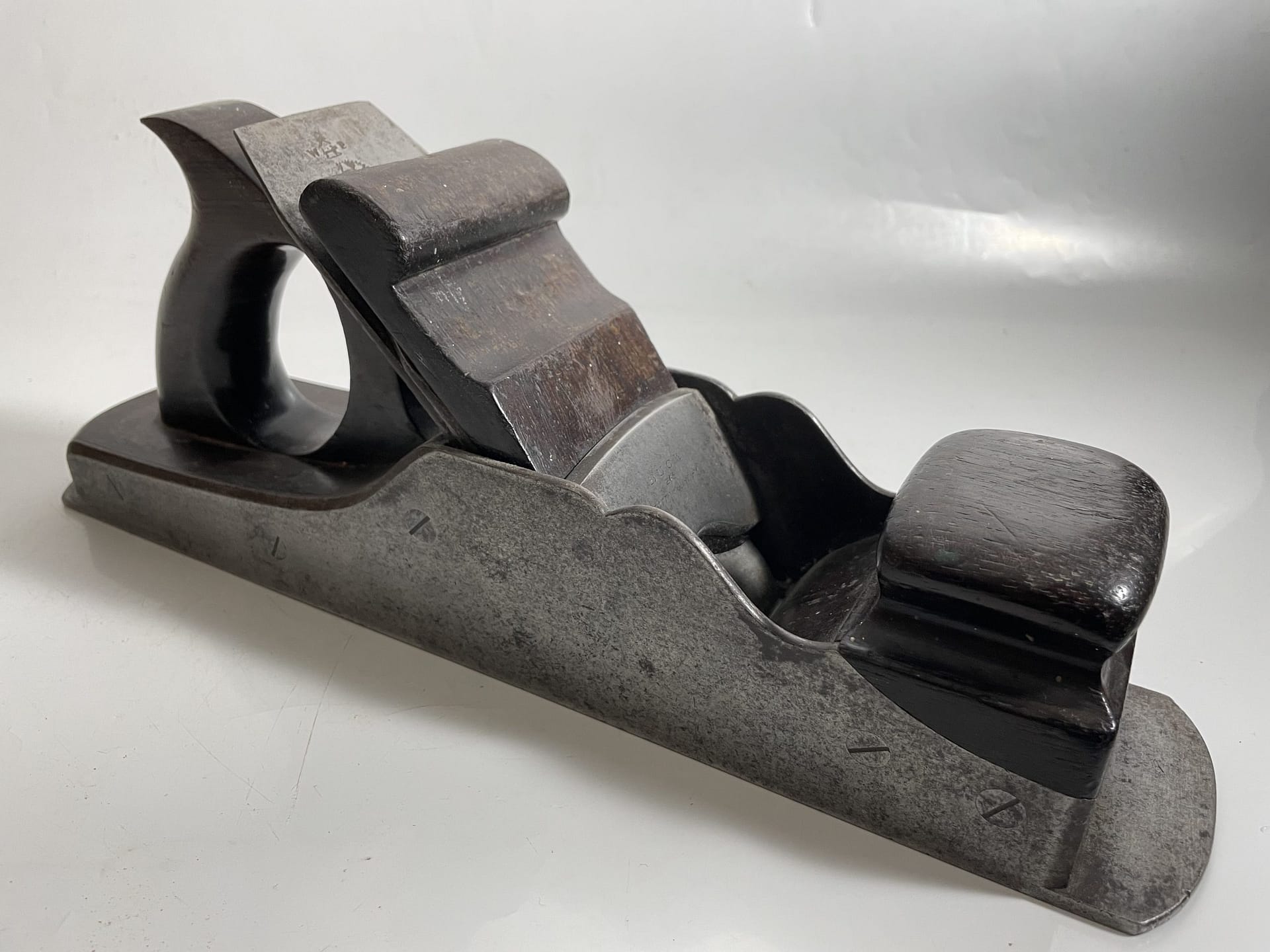 Unmarked 9″ mitre plane with Smith features. Rear infill creosote treated beech, a cost saving decision.