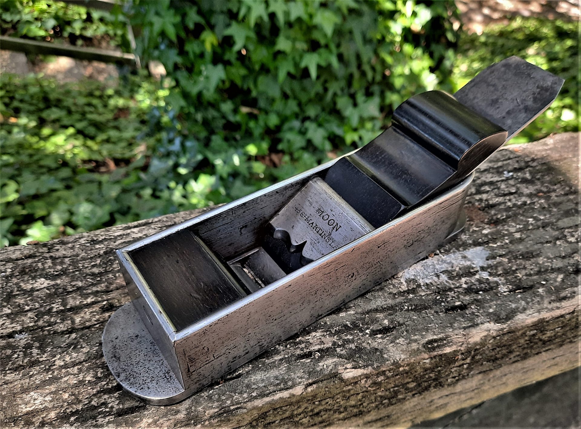 Moon mitre plane, 8″ long, cast iron. Photos by oldtools.uk.co c. 2020.