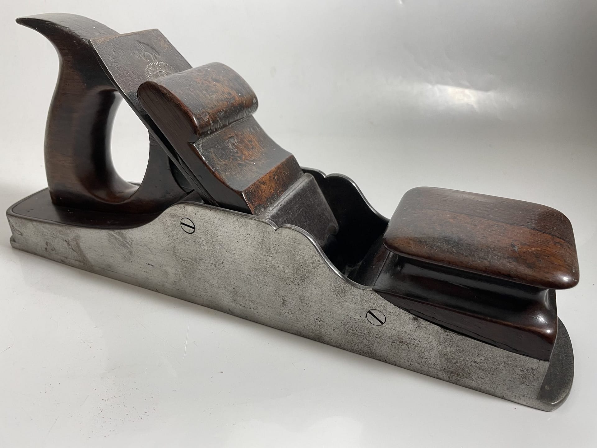 One of the complaints about using mitre planes was difficulty in holding them for longer tasks. This plane was likely an experiment by Towell to address that issue. Body of this mitre is a little different as well: sidewalls bent at the front instead of dovetailed, and a brazed joint is placed at the rear of the the plane, making the sides one continuous piece. This would have created a weakness if users rapped the back of the plane.