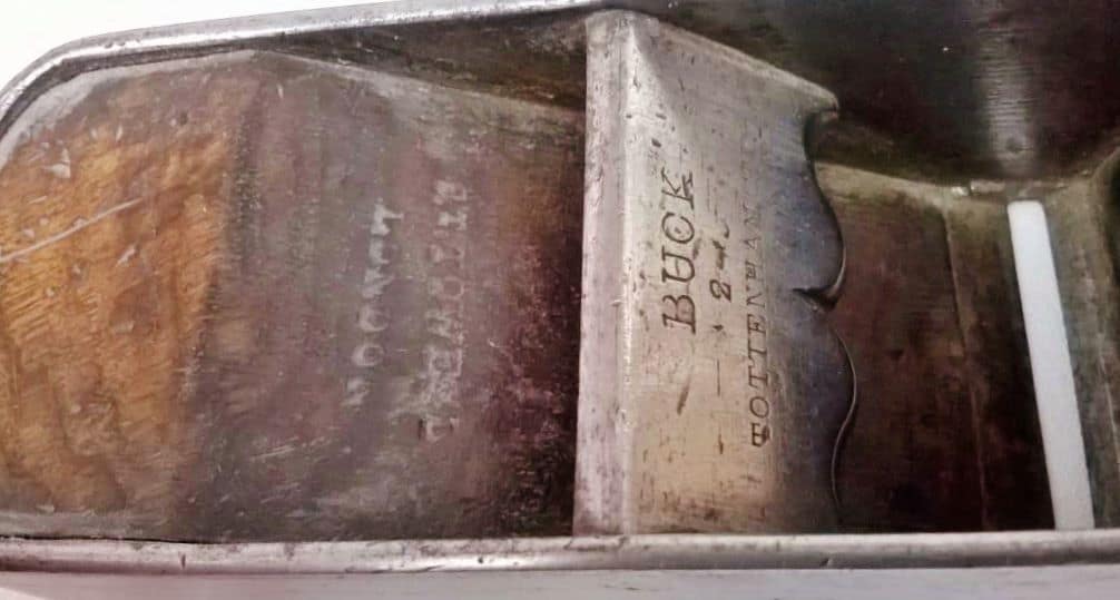 Dual marked plane: Buck on bridge and Towell on rear infill. Someone lost their patience with this tool, and filed the mouth open. Photo by Robert Leach. From website http://www.oldhandtools.co.uk/blog/english-mitre-planes.