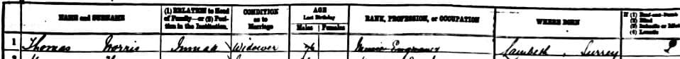 Thomas Norris I, “Music Engraver,” in the Lambeth Workhouse, U.K. census, 1881.