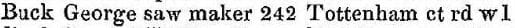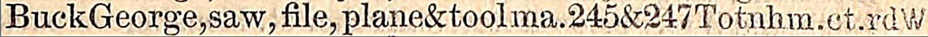 Geo. Buck, 1851 UK census. “Tool Warehouse employing 8 men.” 245 Tottenham Court Road. At the time of the 1851 census, George and Mary Buck and their children were living in the housing quarters above the tool warehouse which was on the ground floor.