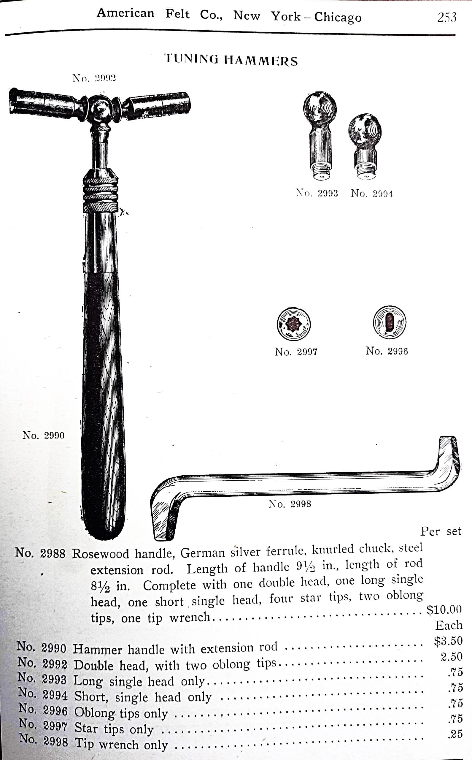 While it is clear that William Braid White preferred the Hale over the Erlandsen, based on my research, an equal number of tuners preferred Erlandsen over Hale through the WWI era. Erlandsen’s hammers and tools, dominant from the Civil War to about 1920, had superior build quality and materials on average, but Erlandsen lacked direct experience working on pianos, and the last level of insight into specific tuning and allied skills which would accompany that. Erlandsen’s focus, however, was on providing a wider range of tools and machinery for workers constructing pianos in factories, while Hale was interested primarily with the piano tuner in the field.