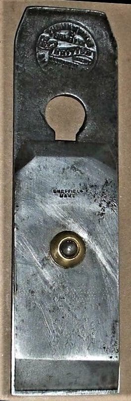 iron shows the arrangement that has been standard for bevel down planes in England and North America for the last 200 years. A machine screw with cheese head under the cutting iron, goes up through the slot and into the brass bolster of the cap iron (England), or chip breaker (U.S.A.). The wooden bed of the plane body would be mortised out to provide clearance for the cheesehead screw.