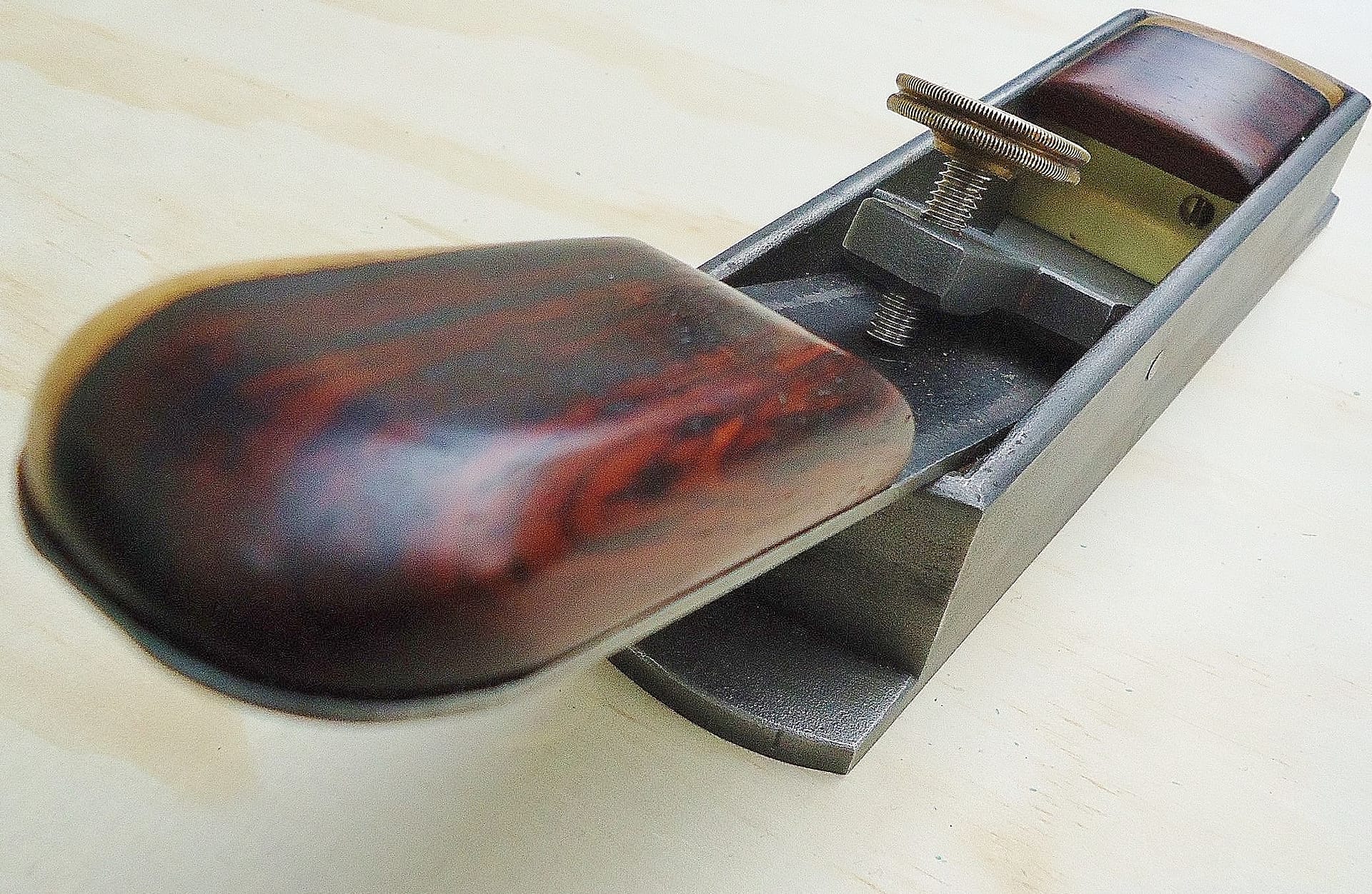 - The front infill, with a concave moulding in front of the mouth, is made of one piece of solid rosewood, instead of having a lesser wood glued underneath the rosewood and a third convex vertical piece in front of the mouth, as seen on Erlandsen mitre planes.