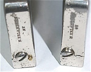 Two Erlandsen cast rabbet planes. The hole in the front of the plane at the bottom is not painted red and appears to be machined, with a bevel around the perimeter. Other differences are the bottom one has a strike button and the body is nickel plated, while the one on the top does not have a strike button and is not plated. Both use cast stanchions to bed the irons. It’s essentially similar in shape and size to the later and more known version with a hole through the nose, except that this one was cast in two pieces. The left side has 2/3rds of the body, leaving 1/3 on the right. No sign of pinning is visible, although the plane still has a fair amount of nickel plating left. As in the previous two rabbets, stanchions were used to bed the iron. This version did not have the red paint inside the escapement.