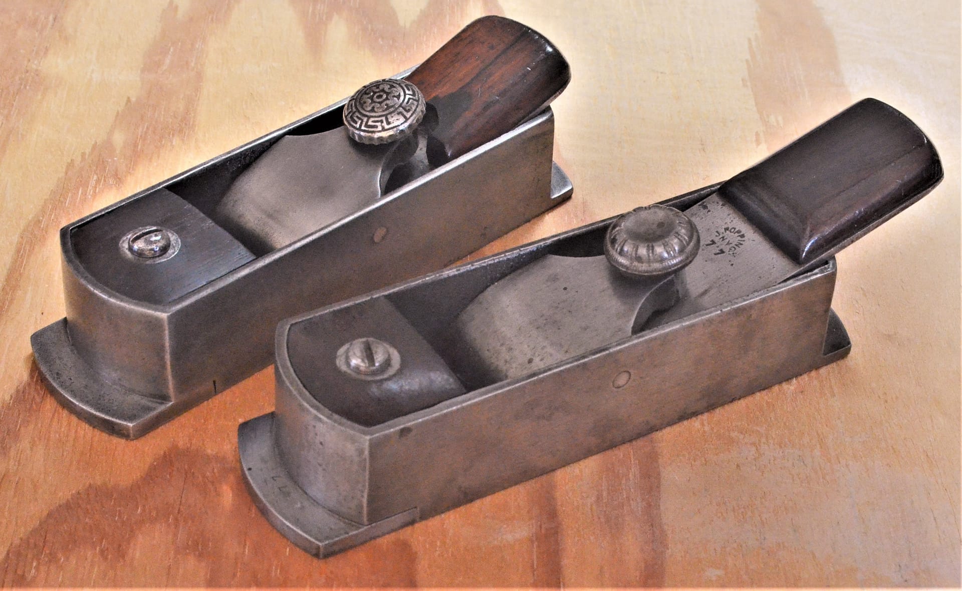 Rosewood plane, with a steel sole and a double iron was user made. The plane in the upper right has a strongly compassed, or convex, bottom (r.).